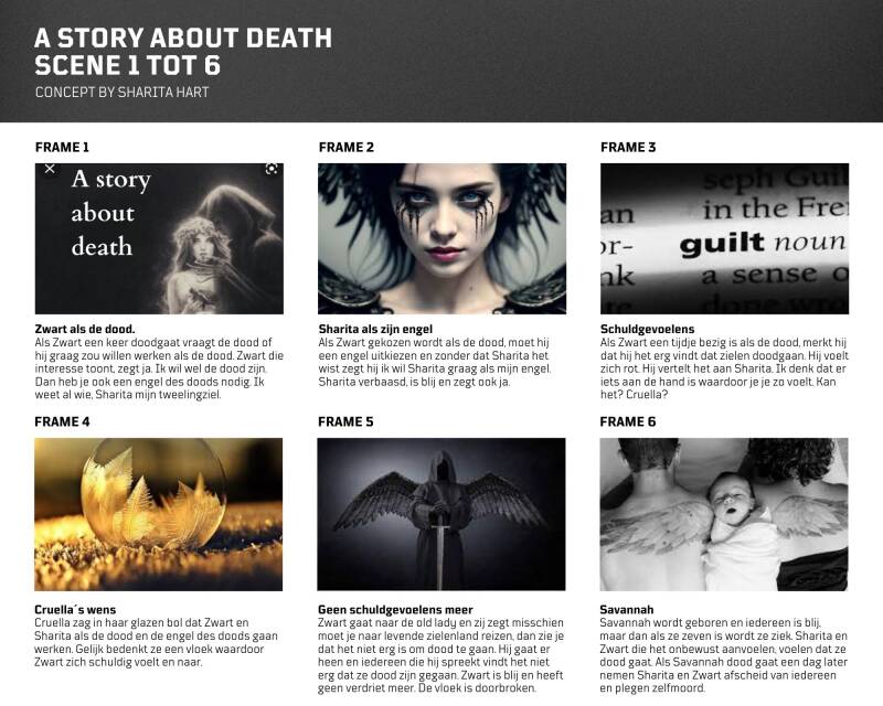 A story about death Sharita is een engel des doods. Zwart komt daarachter en wil de dood worden, zodat ze samen kunnen zijn. Op de dag dat de dood en de engel des doods worden gekozen zien Sharita en Zwart elkaar voor het eerst. Sharita is gelijk verliefd. Als Sharita wordt gekozen als engel des doods, kiest ze Zwart als haar partner. Zwart die zijn geheugen heeft is blij en samen leven ze een leven als engel des doods en de dood. Sharita is 16 als ze elkaar voor het eerst tegenkomen. Zwart zingt If I could tell her en Sharita snapt het. Samen brengen ze zielen naar het land van de levende zielen. Ze hebben een liefdesleven. Duella is ze weer eens kwijt. Zwart neemt haar mee naar de onderwereld en vertelt haar alles wat hij weet over duivels, onderwerelden en de verschillende soorten hel. Als de dood en de engel des doods, moeten ze soms ook criminelen naar de hel brengen. Zwart is 18 jaar ouder dan Sharita. Ze krijgen Savannah en als zij zeven is gaat ze dood en plegen Sharita en Zwart opnieuw zelfmoord om bij hun dochtertje te zijn. In het grote hiernamaals is Sharita verdrietig, want Savannah wordt telkens niet ouder dan zeven. Zwart troost haar en zegt voor alles is een oplossing. Ze maken zich klaar voor een volgend leven, dit keer als heksa. Sharita reincarneert als heksa en Zwart is een reiziger die ze ontmoet als ze zestien is, maar dat is een verhaal voor een andere keer.