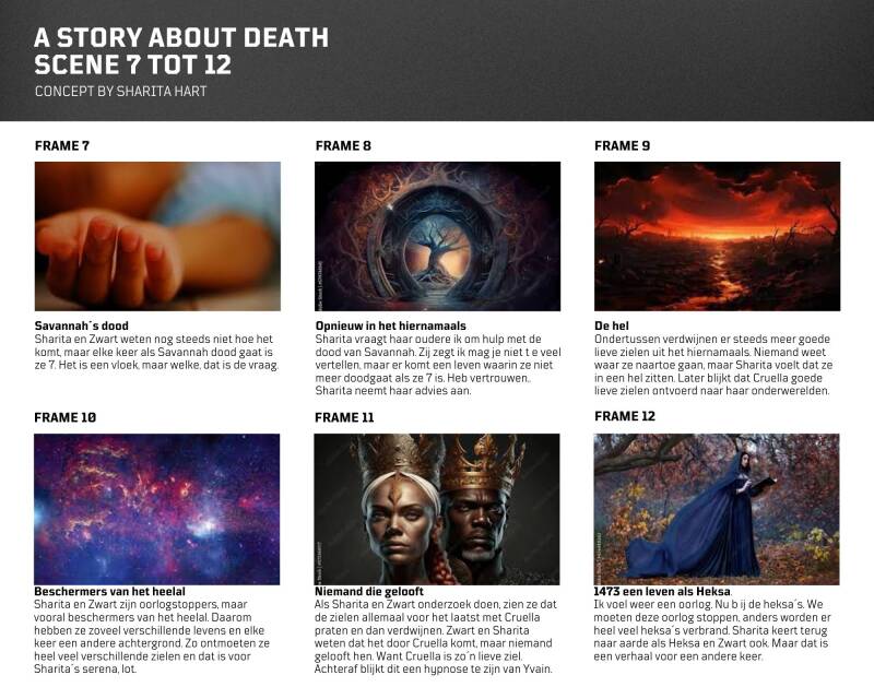 A story about death is het negende deel in de Sharita Chronicles. Door Cruella vindt Zwart het leven als de dood niet leuk. Sharita is de angel of death en hij is de death geworden, maar hij heeft telkens verdrieta, verdriet, als er iemand doodgaat. Als hij door de oudere vrouw erachter komt dat het Cruella is die de pest heeft veroorzaakt en dat mensa´s doodgaan, omdat het hun tijd is, voelt hij minder verdriet. Cruella heeft een glazenbol en kan daarmee Sharita en Zwart in de gaten houden, maar in dit leven lukt het haar niet ze voorgoed creatief te martelen.